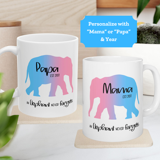 Mama/Papa Est Year Elephant Never Forgets—Baby Loss Remembrance (ceramic coffee mug)