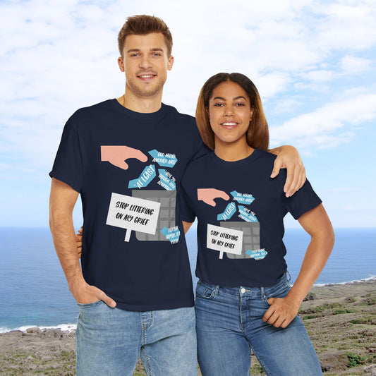 Platitudes in the Trash, Stop Littering on my Grief—Grief Awareness and Education (unisex t-shirt)