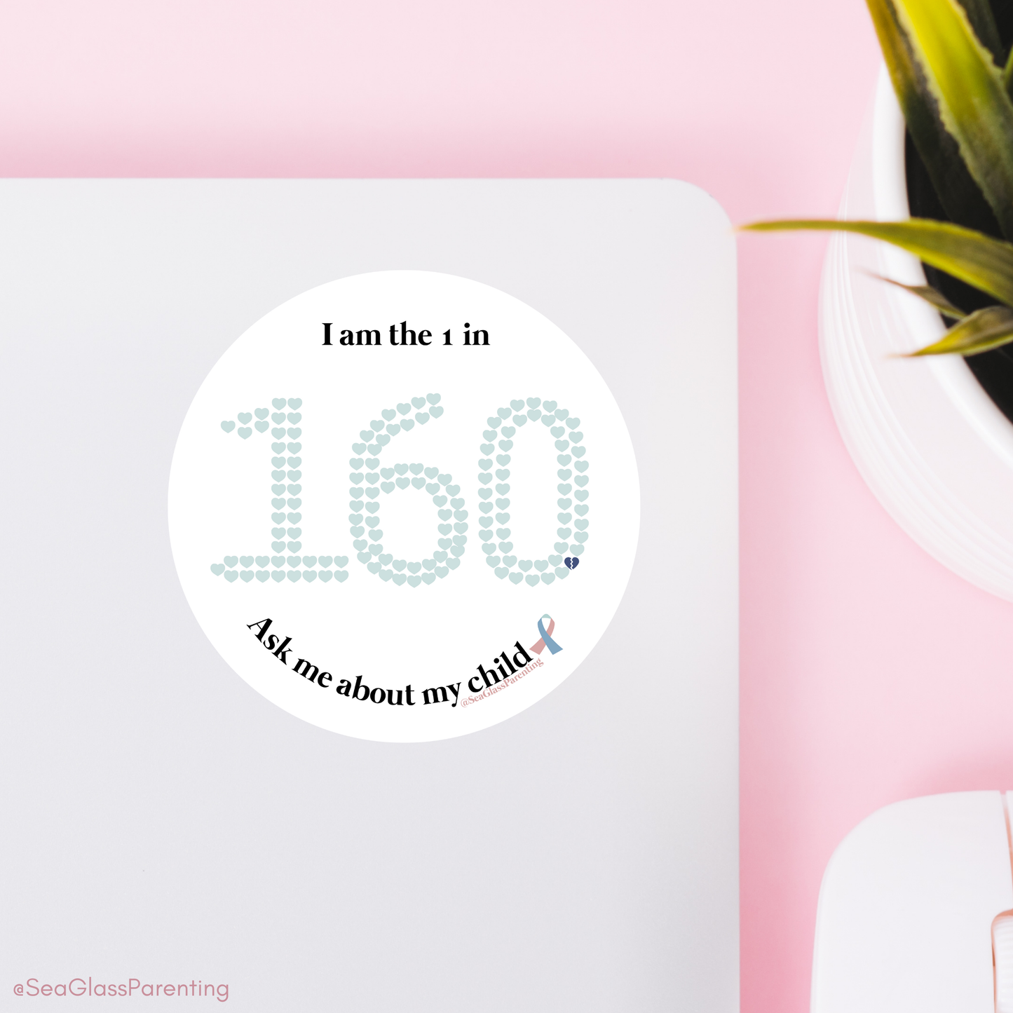 Sticker text: "I am the 1 in 160. Ask me about my child" surrounding an image of 159 hearts and 1 broken heart.