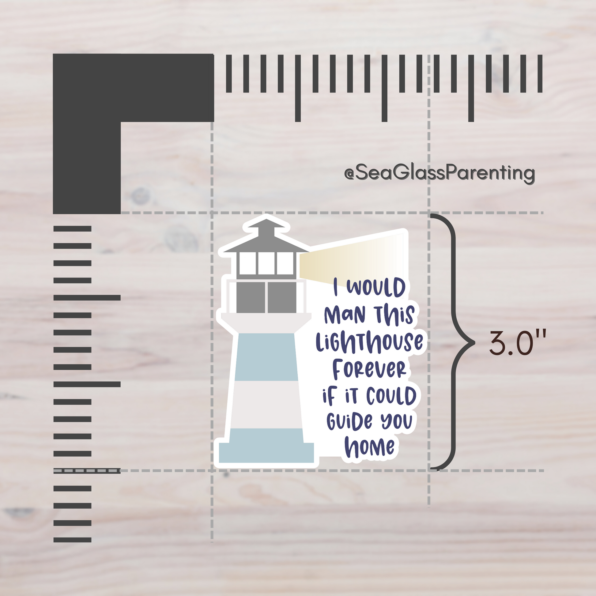 Sticker Design: "I would man this lighthouse forever if it could guide you home" next to the image of a lighthouse