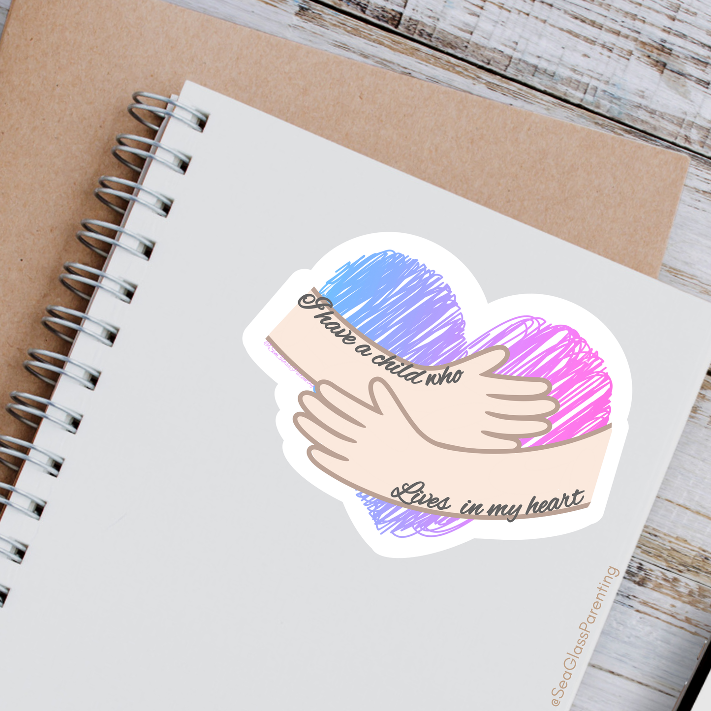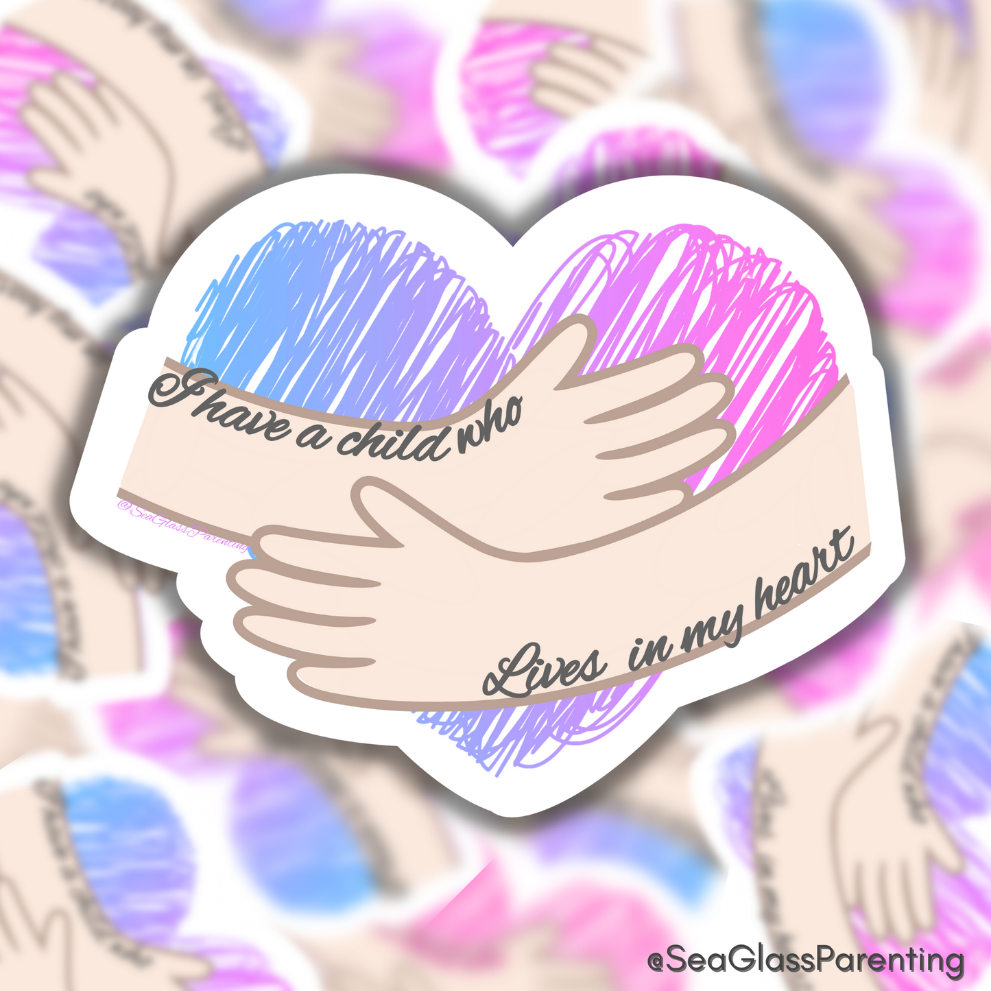 Sticker Text: "I have a child who lives in my heart" in italicized text embedded in an image of hands holding a heart.