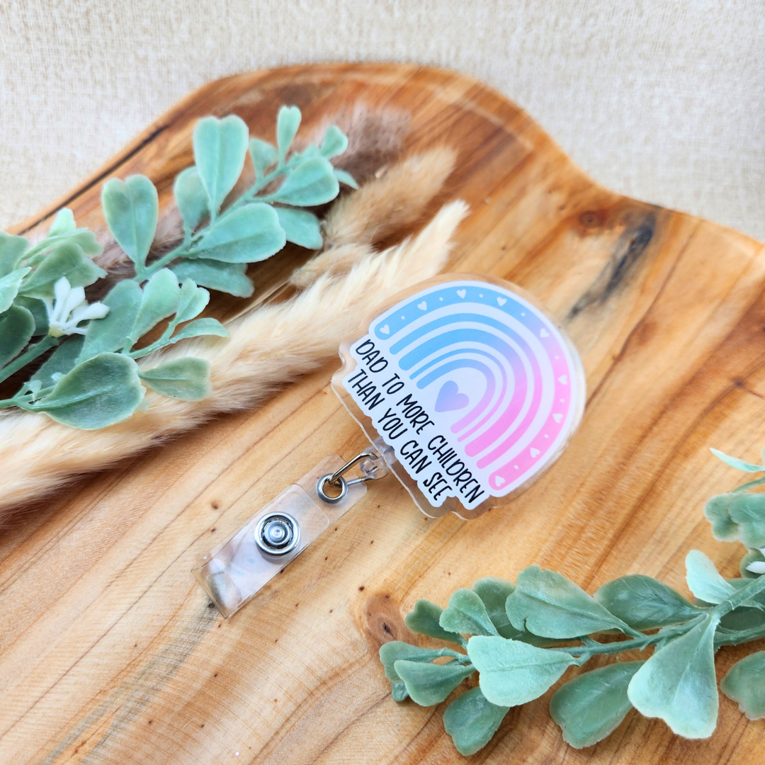 Badge Reel Design: "Mom/Dad* to more children than you can see" in black text under a blue-to-pink gradient rainbow.