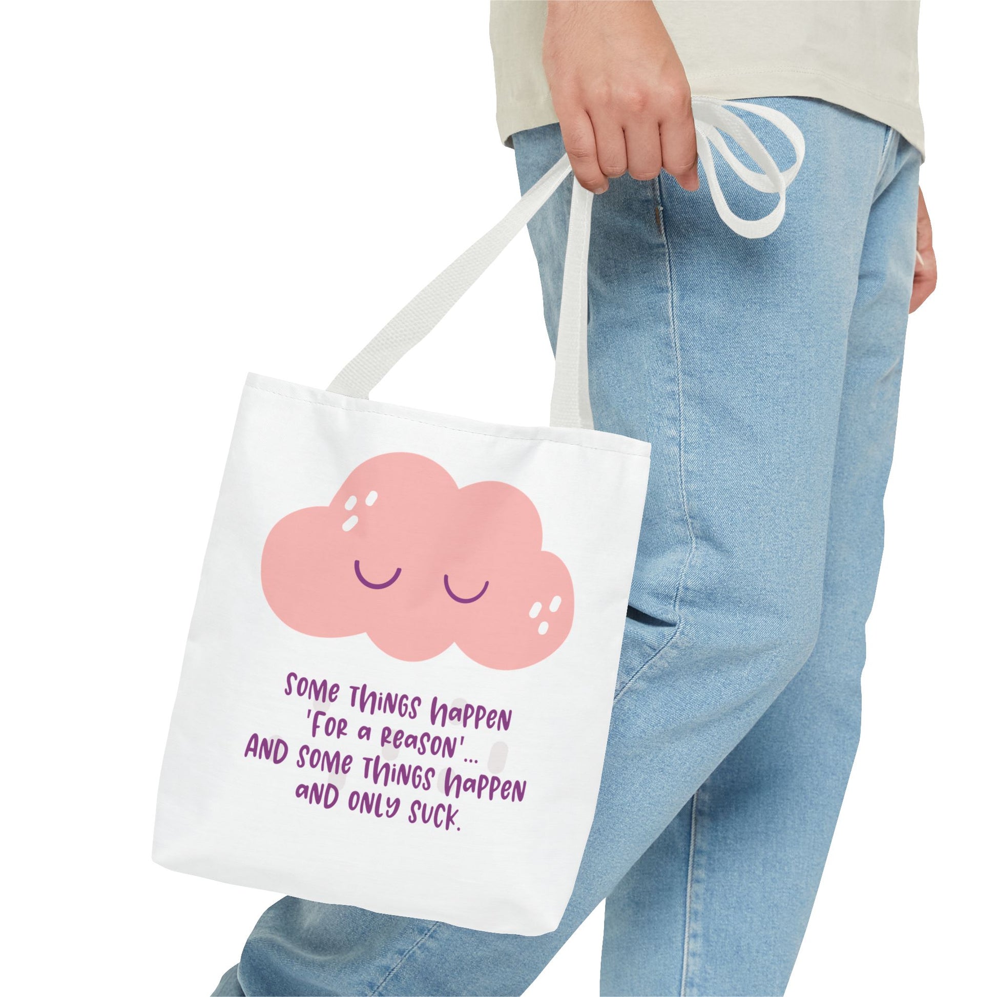 Tote Bag Design: "Some things happen 'for a reason'...And some things happen and only suck" under the image of a cloud weeping rain.