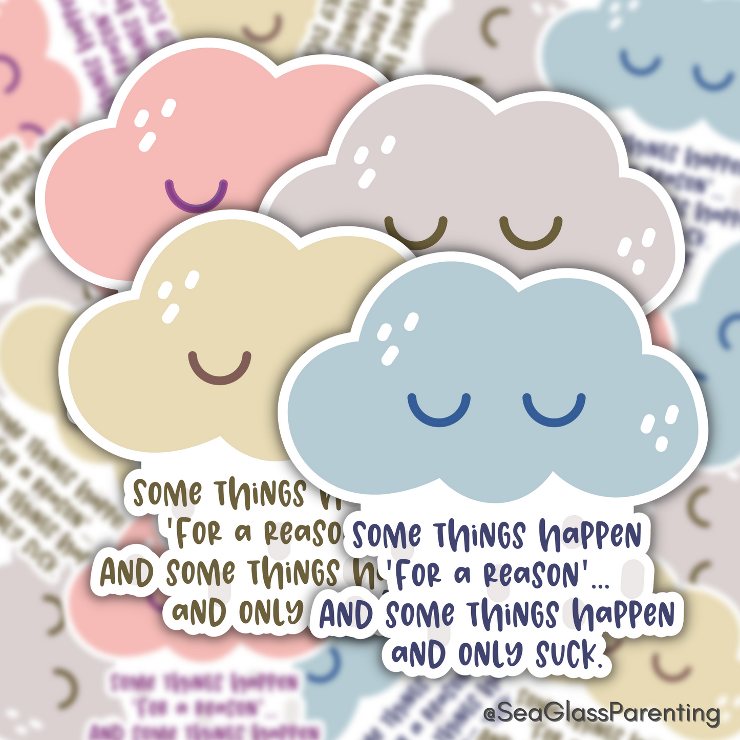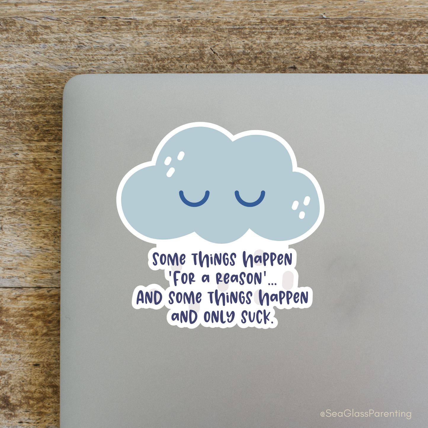 Sticker Design: "Some things happen 'for a reason'...And some things happen and only suck" under the image of a cloud weeping rain.