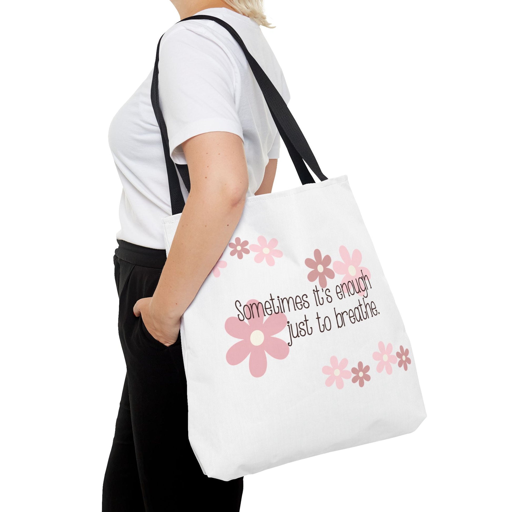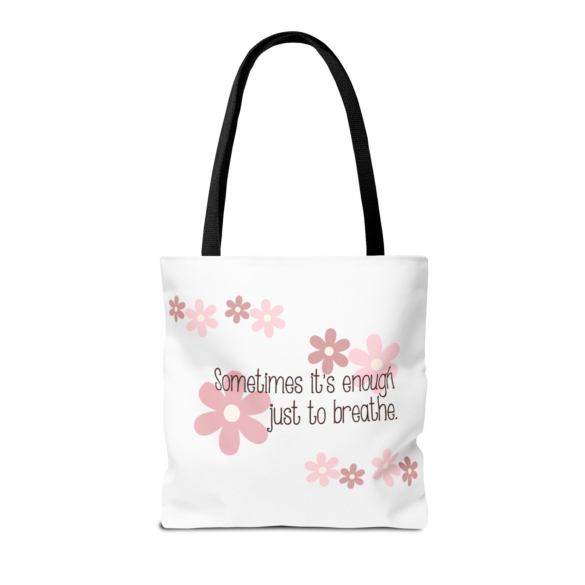 Tote Bag Design: "Sometimes it's enough just to breathe" in brown text over the image of pink and yellow flowers.