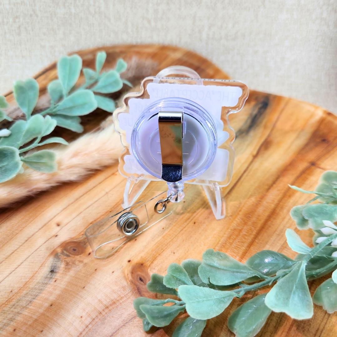 This listing is for one (1) acrylic badge reel, 2.0" wide x 1.8" tall, with a retractable soft plastic badge strap.