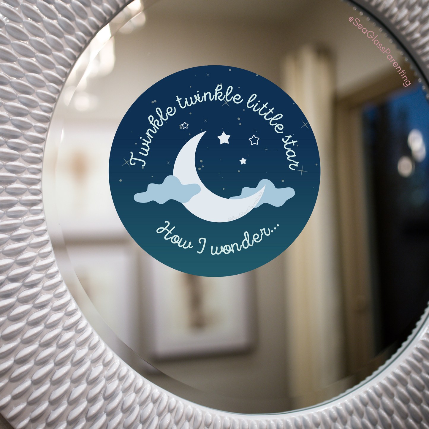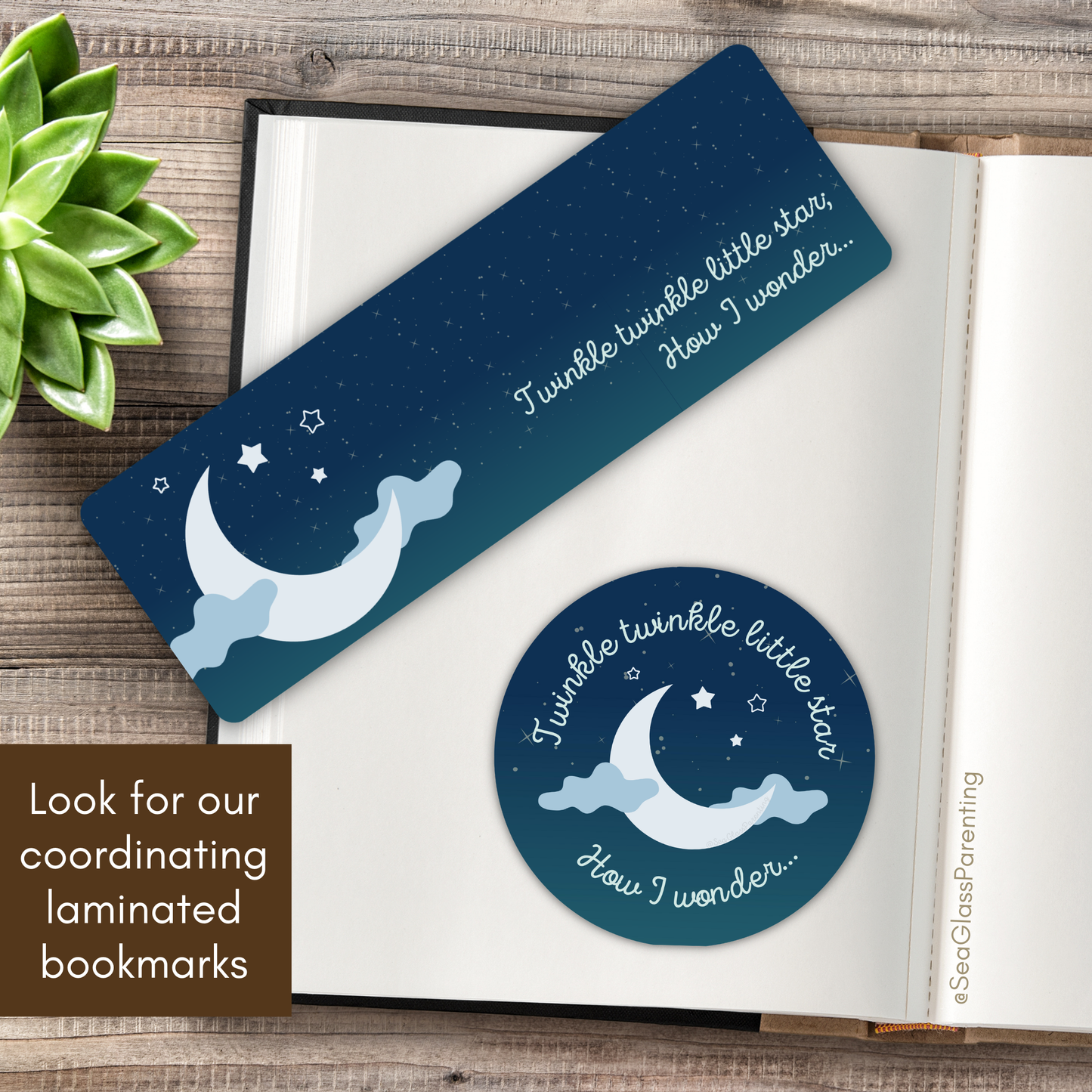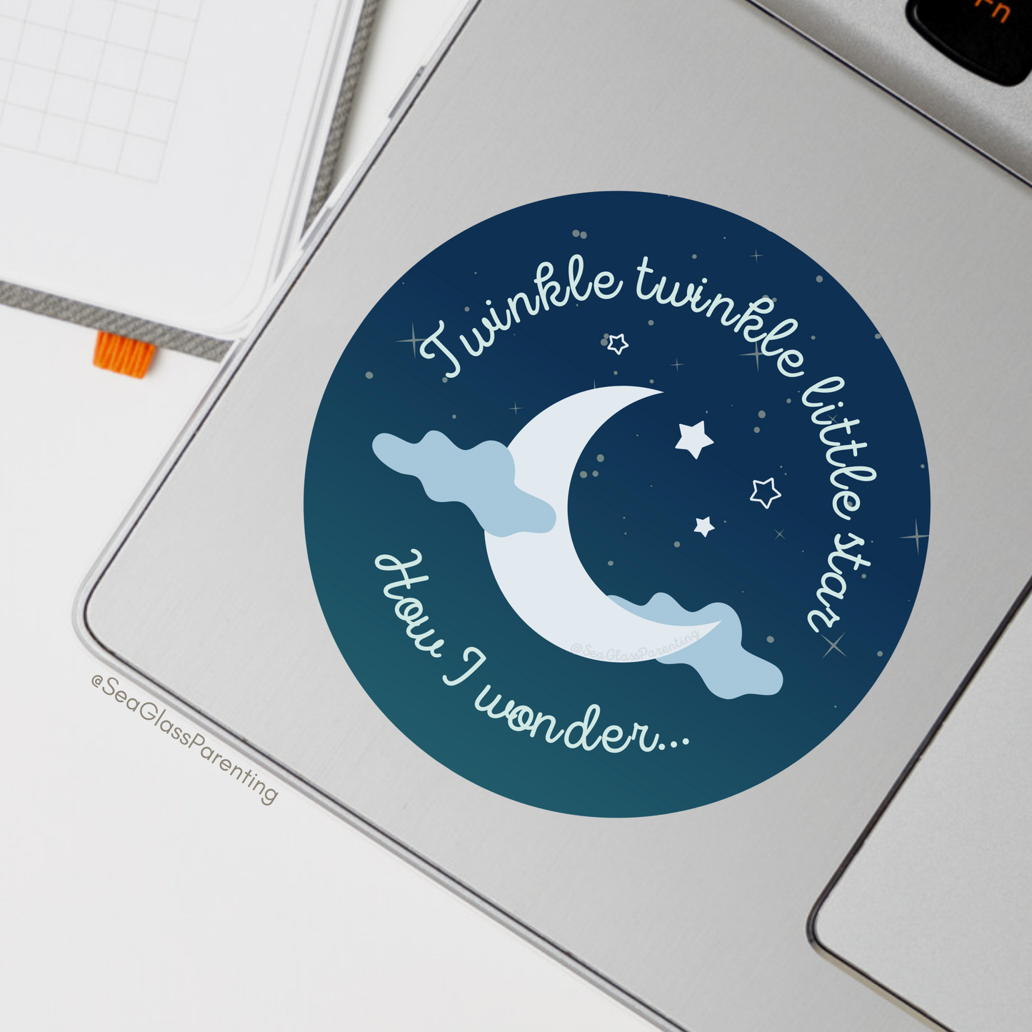 Sticker Text: "Twinkle twinkle little star, How I wonder..." in white text on a background of a night sky with crescent moon and stars.