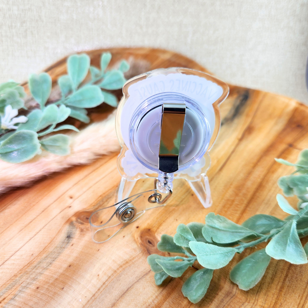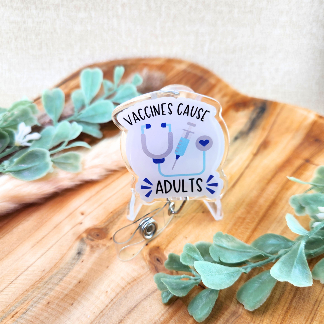 Badge Reel Design: "Vaccines cause *Adults*" in black text surrounding the image of a stethoscope wrapped around a vaccine needle.